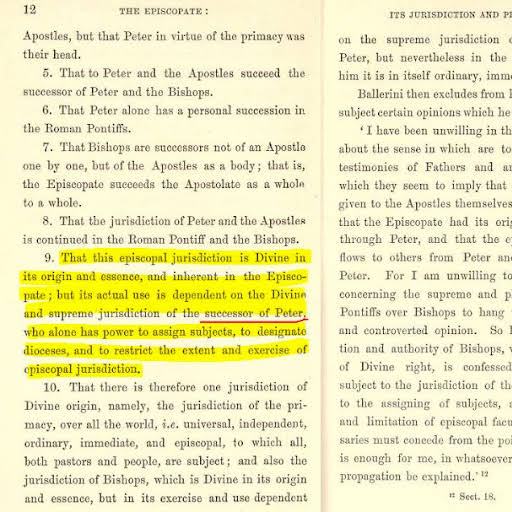 "Que esta jurisdicción episcopal es divina en su origen y esencia, e inherente al episcopado; pero su uso real depende de la jurisdicción divina y suprema del sucesor de Pedro, quien es el único que tiene poder para asignar súbditos, designar diócesis y restringir la extensión y el ejercicio de la jurisdicción episcopal."