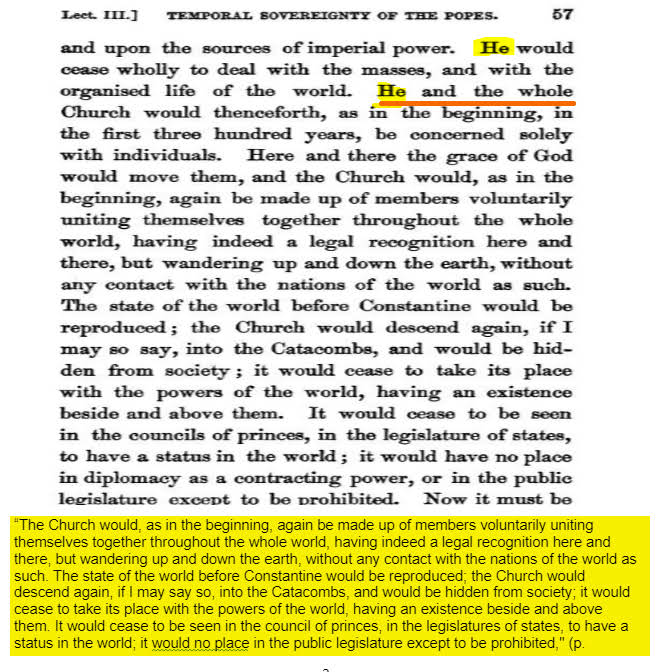 "Los principales intérpretes de la Escritura, como lo expone Santo Tomás, entienden unánimemente por esta palabra discessio la renuncia general de los reinos a la fe católica y a la Iglesia, la apostasía universal de las sociedades y de las naciones, apostatio gentium. Y es también uno de los caracteres distintivos de nuestra época, al mismo tiempo que la esencia misma de la Revolución, la separación de la Iglesia y del Estado; la apostasía de las sociedades como tales, la desorganización social del mundo católico, el ateísmo político y legal. Esta apostasía de las sociedades está ya consumada, o poco menos. ¿Cuál es el Estado, hoy día, sobre la tierra, que reconozca oficialmente y como una institución divina todos los derechos de la Iglesia, y que se someta, antes que a toda otra ley, à la ley de Jesucristo, promulgada, explicada y aplicada soberanamente por el Papa, Jefe de la Iglesia? No existe ya uno solo de estos. Llegó, pues, la señal dada por San Pablo, y seguramente no es a nosotros, cristianos del siglo XIX, a quienes se dirige aquella palabra: ne terreamini: no temáis."