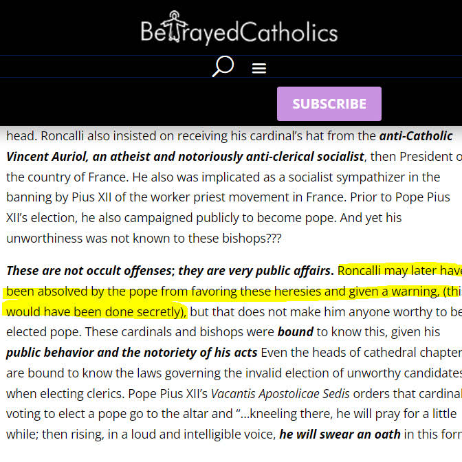 Teresa nos quiere hacer creer que S.S.Pío XII elevó a Cardenal y mantuvo de Cardenal a un hereje pertinaz público y notorio, y nos quiere hacer creer que esto no lleva por la propia lógica a apuntar a S.S.Pío XII como promotor de un desviado público y notorio de la fe hacia el papado, apela al Concilio Vaticano y dice que se debe demostrar que S.S.Pío XII "fue elegido inválidamente o que fue una preelección herética (Can. 2233 y San Pablo: “Pero PROBAR todas las cosas; retened lo bueno” 1 Tes. 5:2)" (sic). sigue Teresa "Esto es algo que solo un futuro concilio ecuménico y/o un papa elegido canónicamente podría determinar." (sic) Pero sin embargo vemos que Teresa está por encima del concilio ecuménico y el Papa canónicamente elegido, que cita, para con Roncalli, el cual para ella era un hereje público y contumaz antes de ser elevado a Cardenal y durante su Cardenalato conocido por todo los Obispos del mundo, menos por S.S.Pío XII, y si lo conocía recurre a esas reuniones secretas inventadas por Teresa entre S.S.Pío XII y Roncalli donde según la imaginación de Teresa "Roncalli pudo haber sido más tarde absuelto por el Papa de favorecer estas herejías y recibir una advertencia (esto se habría hecho en secreto)"(sic) absolución de S.S.Pío XII que no tiene ningún valor para Teresa ya que se inventa tal absolución pero a la par dichas absoluciones no tienen poder ninguno, ya que según los sofismas novelescos de Teresa, llenos citas canónicas, como bombas de humo, lo que S.S.Pío XII absolvió no tiene fuerza alguna, ya que Teresa Stanfill Benns anatematiza a todos los Cardenales y a todos los Obispos del Orbe y los acusa de apostatar el mismo día 28 de octubre de 1958 porque debían conocer esas ofensas públicas, que S.S.Pío XII no conocía o incluso había absuelto (sic)