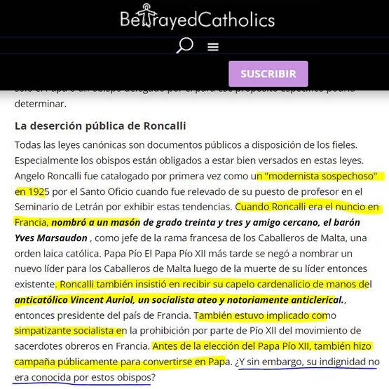 Teresa Stanfill Benns se está metiendo en un barrizal por querer defender que el mismo día 28 de octubre de 1958 que fue la elección del No-Papa Roncalli, se produjo la Apostasía masiva de todo el Cuerpo Episcopal, la Gran Apostasía, al considerar ella que todos estaban al tanto de que Roncalli era un hereje pertinaz, público y notorio, cuyos actos escandalosos eran conocidos por todos o debían serlo, pero que S.S.Pío XII lo mantuvo de Cardenal desde 1953 a 1958, cuando esos escándalos se habían producido antes y durante su cardenalato.