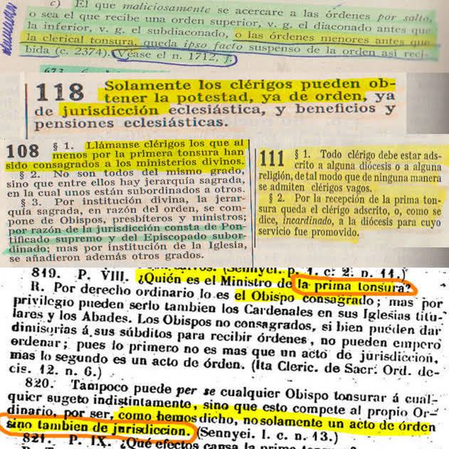 Los ordenados Sacerdotes y Diáconos por Lefebvre (aquí entraría cualquier Obispo) que fue un Obispo consagrado válido y lícito (obviamos la tesis Liénart), que perdió la jurisdicción el 8 de diciembre de 1965 al unirse a la secta de Montini, y podía ordenar Diáconos y Sacerdotes (en este caso ilícitamente al perder la jurisdicción) ya que VAS no lo impide para la Sede vacante, PERO, Lefebvre al perder la jurisdicción el 8 de diciembre de 1965 y al no haber Papa desde el 9 de Octubre de 1958 QUE DELEGUE JURISDICCIÓN ALGUNA Y NECESARIA, Lefebvre no pudo hacer mediante el rito de la Tonsura, que es un acto jurídico que permite cambiar a la persona jurídica de laico pasar a ser persona jurídica de clérigo para poder recibir las órdenes, porque lefebvre no tenía poder de jurisdicción al perderlo (can 188.4, Cum ex) ni el Papa lo puede delegar porque no hay Papa, y el Papa es él único que tiene jurisdicción universal, y si no hay poder jurisdiccional que emane del Papa, y el Obispo lo ha perdido, no puede haber cambio de la personalidad jurídica de laico a la de clérigo que sucede en el rito de la Tonsura, y así no se pueden recibir las ordenes.