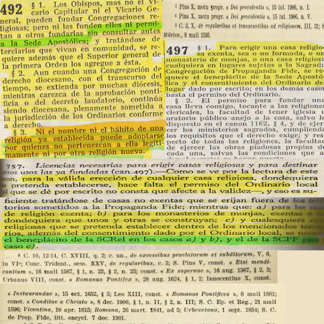 PARA LA VALIDA ERECCIÓN DE CUALQUIER CASA RELIGIOSA, dondequiera que sea hace falta el PERMISO DEL ORDINARIO local (no tenemos), para las casas de religión exenta, para los monasterios de monjas, exentas o no, donde quieran que sean construidos,se necesita CONSENTIMIENTO DEL ORDINARIO DEL LUGAR (no hay), Y BENEPLACITO DE LA SANTA SEDE.(no tenemos desde el 9 de octubre de 1958)