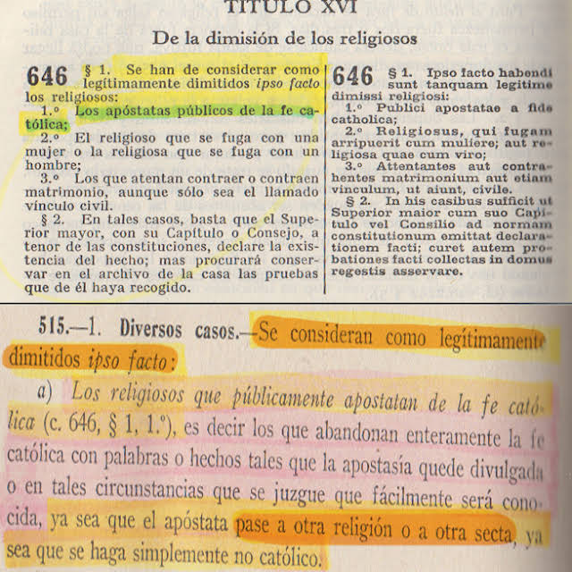 Se considera como legítimamente dimitidos ipso facto...el apóstata que se pase a otra religión o a otra secta...