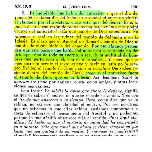 2. Es indudable que habla del anticristo y que el día del juicio (él le llama día del Señor) no vendrá si antes no viniere el llamado por él apóstata, claro está que del Señor. Esto, si puede decirse con razón de todos los impios, ¿cuánto más podrá decirse del anticristo? ¿En qué templo de Dios se sentará? No sabemos si será en las ruinas del templo de Salomón o en la Iglesia. Es claro que el Apóstol no llamaría templo de Dios al templo de algún ídolo o del demonio. Por eso algunos pretenden que este pasaje que habla del anticristo se entienda no del príncipe, sino de todo su cuerpo, o sea, de la multitud de hombres que pertenecen a él, con él a la cabeza. Y creen que es más correcto seguir el texto griego y decir en latín no in templo Dei (en el templo de Dios), sino in templum Dei sedeat (se siente dentro del templo de Dios), como si el anticristo fuera el templo de Dios, que es la Iglesia. Así decimos: Sedet in amicum (se tiene por amigo), o sea, como amigo, y otras locuciones semejantes.