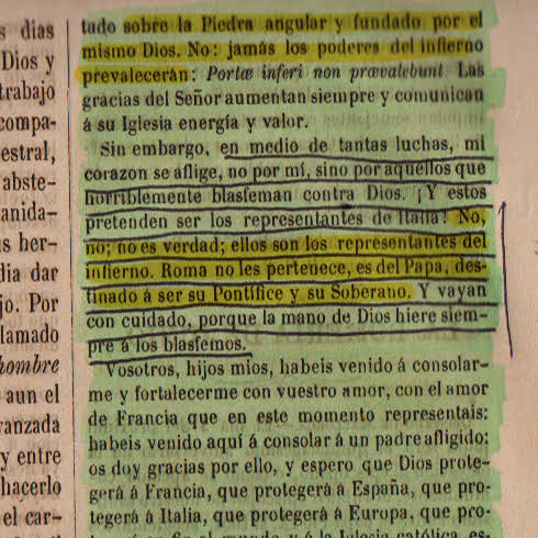 Todo esto se puede leer en el Magisterio de S.S. Pío IX anterior a 1878, que alguno está puesto en este blog, y en distintos libros sobre la usurpación del poder temporal del Papa.