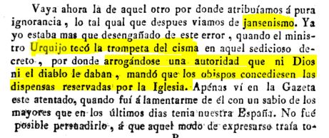 "Vaya ahora la de aquel otro por donde atribuíamos a pura ignorancia, lo tal qual que después viamos de jansenismo. Ya yo estaba más que desengañado de este error, cuando el ministro Urquijo tecó la trompeta del cisma en aquel sedicioso decreto, por donde arrogándose una autoridad que ni Dios ni el diablo le daban, mandó que los obispos concediesen las dispensas reservadas por la Iglesia. Apenas ví en la Gazeta este atentado, cuando fuí á lamentarme de él con un sabio de los mayores que en los últimos días tenía nuestra España. "
