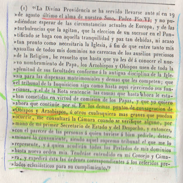 El cisma del rey Carlos IV y su ministro Urquijo, durante la Sede vacante de 1799 (fallece S.S.Pío VI), arduos estos impíos, pretendieron usurpar los poderes y jurisdicción del Papa en vida, alegando las "circunstancias" y "antiguas disciplinas."