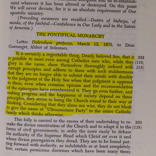 "Ciertamente es una cosa lamentable, amado Hijo, que sea posible encontrar incluso entre los católicos hombres que, mientras se glorían en el nombre [de católicos], se muestran completamente imbuidos de principios corruptos y se adhieren a ellos con tal terquedad que no pueden someter su mente con docilidad al juicio de la Santa Sede cuando ese juicio se les opone, incluso cuando la opinión común y la recomendación del episcopado lo han corroborado. Y lo que es más, cuando el progreso y la felicidad de la sociedad dependen de estos principios, se esfuerzan por acercar a la Iglesia a su forma de pensar. y creyendo tercamente que sólo ellos son sabios, no se avergüenzan de dar el nombre de “partido ultramontano ” a toda la familia católica que piensa lo contrario."