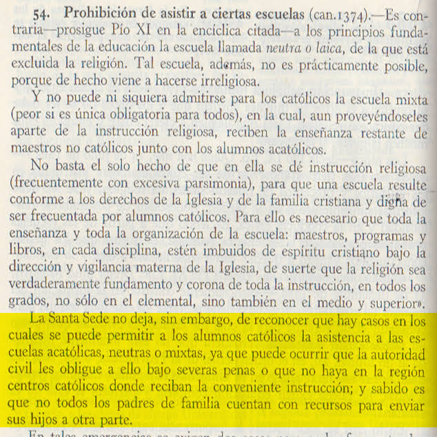 LA SANTA SEDE NO DEJA, SIN EMBARGO, DE RECONOCER QUE HAY CASOS EN LOS CUALES SE PUEDE PERMITIR A LOS ALUMNOS CATÓLICOS LA ASISTENCIA A LAS ESCUELAS ACATÓLICAS, NEUTRAS O MIXTAS, YA QUE PUEDE OCURRIR QUE LA AUTORIDAD CIVIL LES OBLIGUE A ELLO BAJO SEVERAS PENAS O QUE NO HAYA EN LA REGIÓN CENTROS CATÓLICOS DONDE RECIBAN LA CONVENIENTE INSTRUCCIÓN; Y SABIDO ES QUE NO TODOS LOS PADRES DE FAMILIA CUENTAN CON RECURSOS PARA ENVIAR SUS HIJOS A OTRA PARTE.