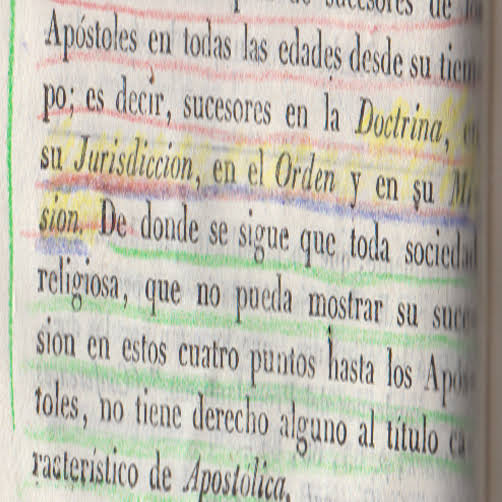 "Las últimas palabras de Jesucristo a sus Apóstoles fueron : Id, instruid á todas las naciones , bautizandolas en el nombre del Padre, y del Hijo, y del Espíritu Santo ; y mirad, yo estoy con vosotros hasta la consumación de los siglos (Matth. 28, 20) . El suceso ha probado que la vida de los Apóstoles no podía pasar el término ordinario de la vida humana ; y así, la comisión de predicar y administrar los sacramentos , y la promesa de la asistencia divina, que iba unida á esta misión , miraban no menos á los sucesores que á los Apóstoles mismos. Esto prueba que debe haber una série no interrumpida de sucesores de los Apóstoles en todas las edades desde su tiempo; es decir , sucesores en la DOCTRINA, en su JURISDICCIÓN, en el ORDEN y en su MISIÓN. De donde se sigue que toda sociedad religiosa , que no pueda mostrar su sucesión en estos cuatro puntos hasta los Apóstoles , no tiene derecho alguno al título característico de Apostólica."