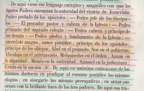 De aquí ese unánime entusiasmo de los mismos doctores en prodigar al romano pontífice los mismos elogios, en otorgarle las mismas prerrogativas, en ornar sus sienes con la brillante tiara de los tres poderes.